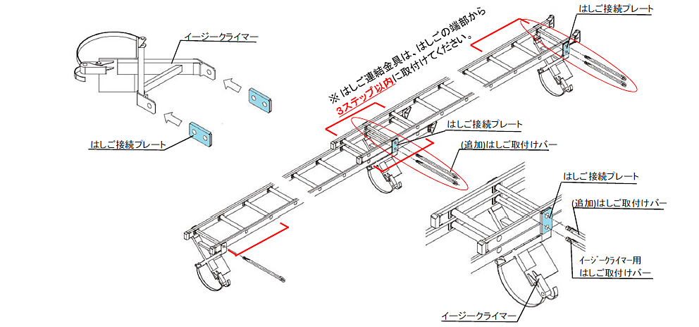 ・本製品はイージークライマーをはしご端部から3ステップ以内に取付できない時の補強用にご使用ください。
