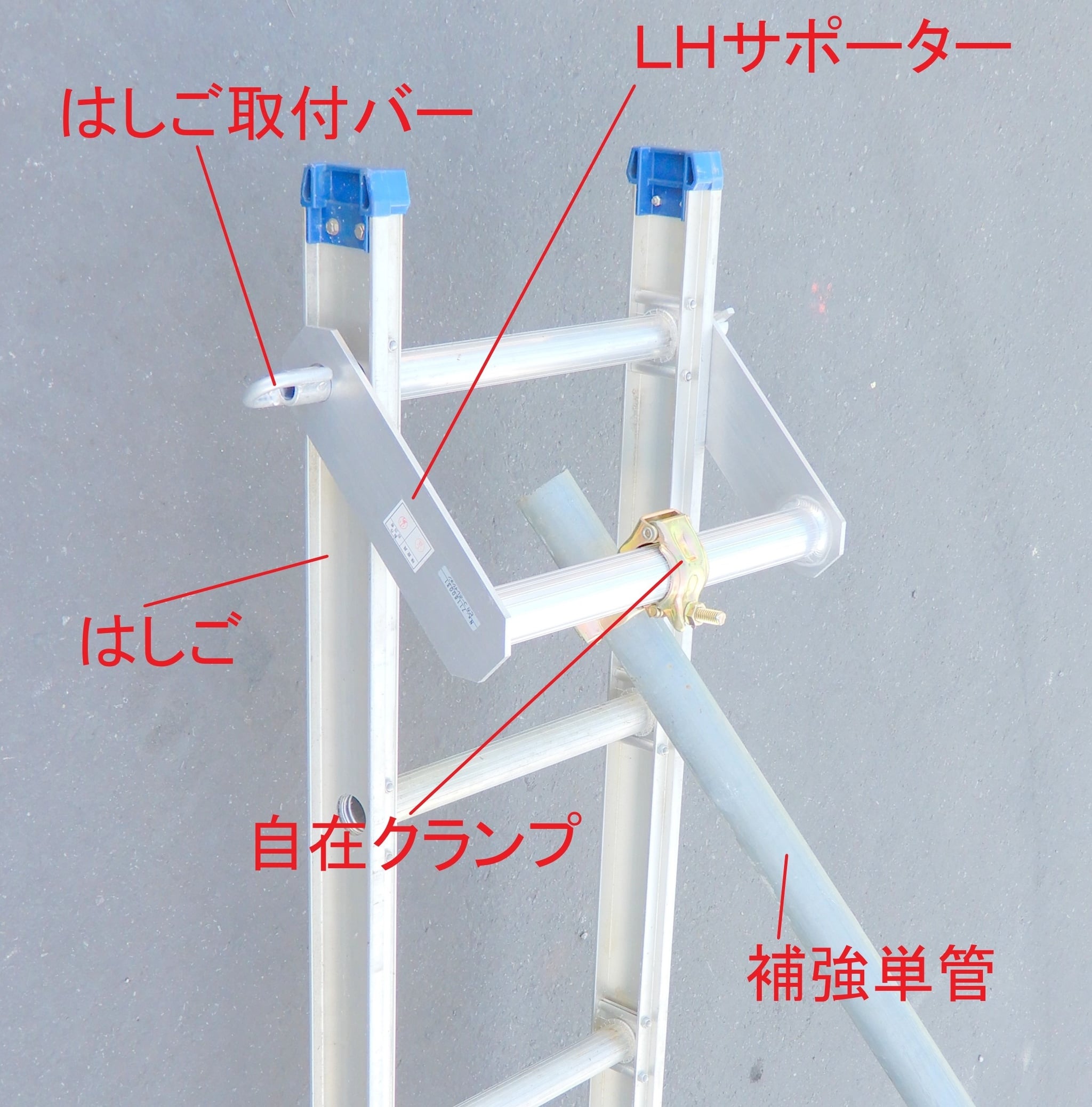 ・本製品使用時には、はしごにねじれが生じないように単管1本又は2本で補強してください。