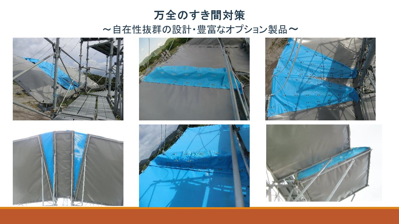 万全の隙間対策。足場側の折り返し。隙間・コーナー・端部対策により完全養生が可能